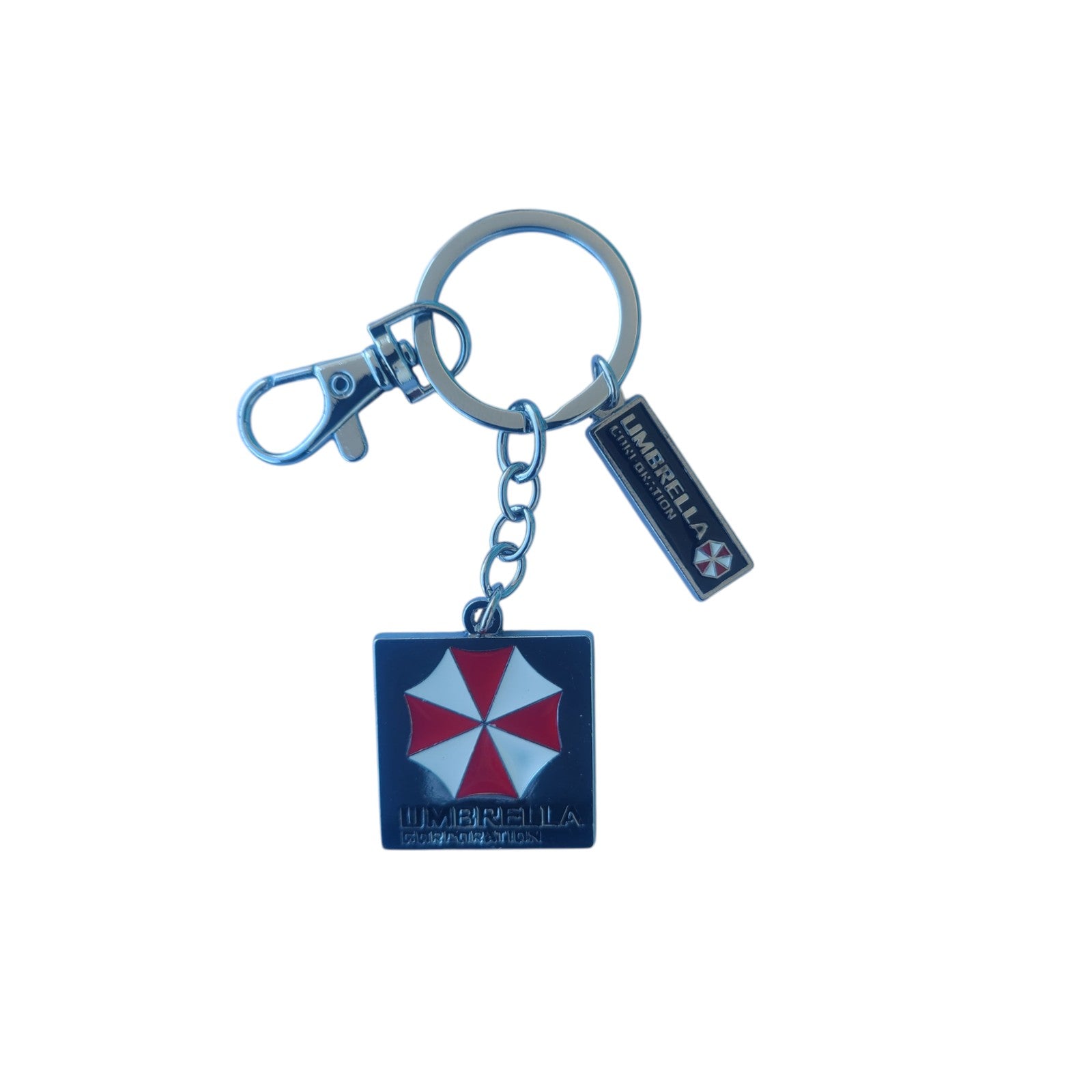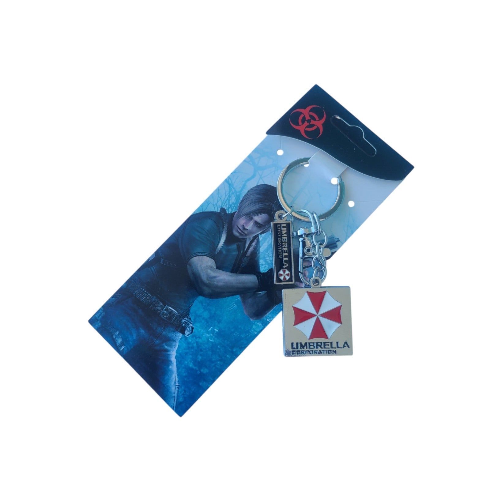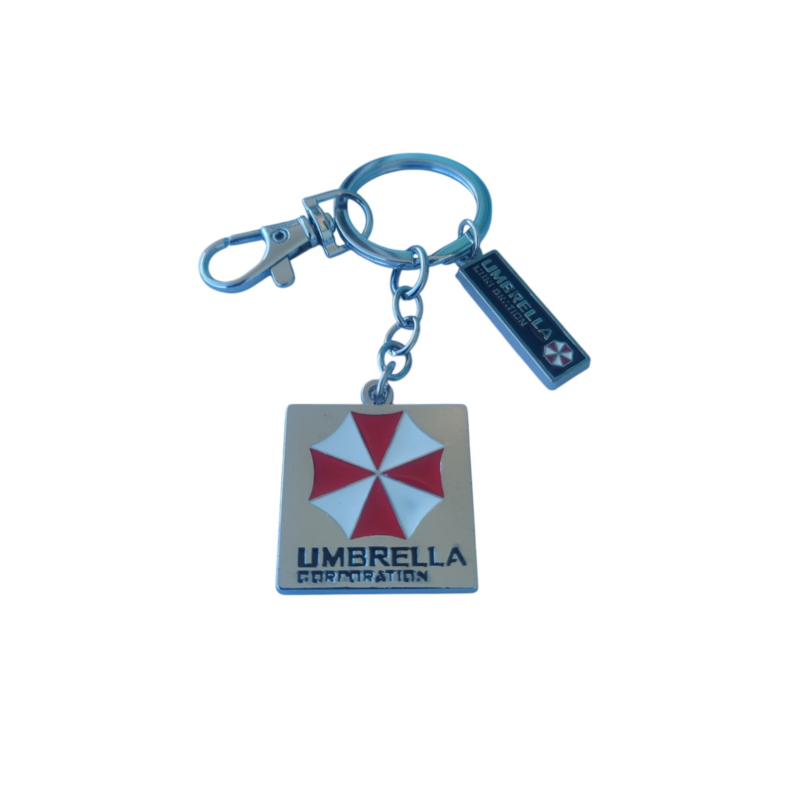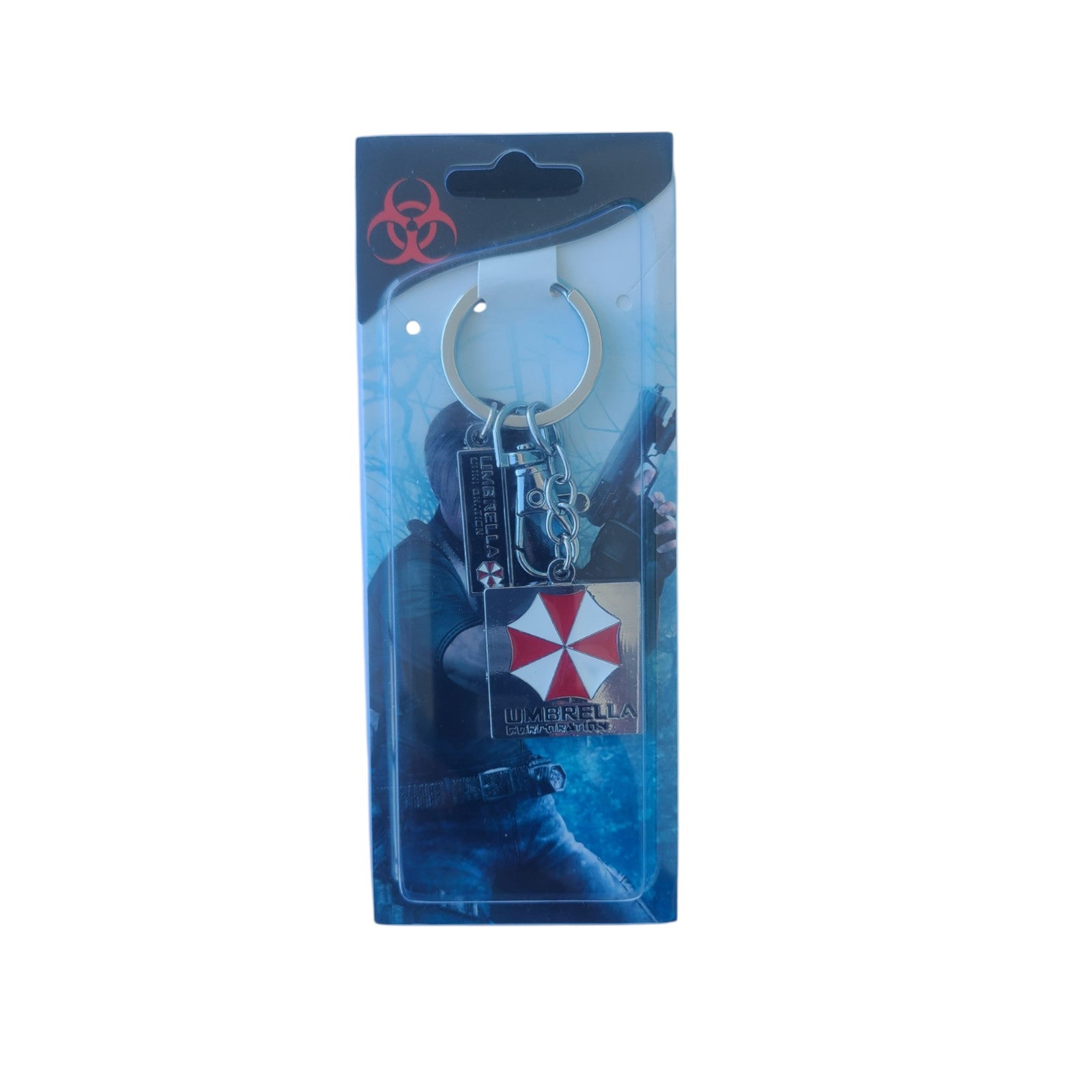 - This keychain features the iconic Umbrella Corporation logo from Resident Evil. Made of solid metal, it measures 4cm wide by 4cm high.